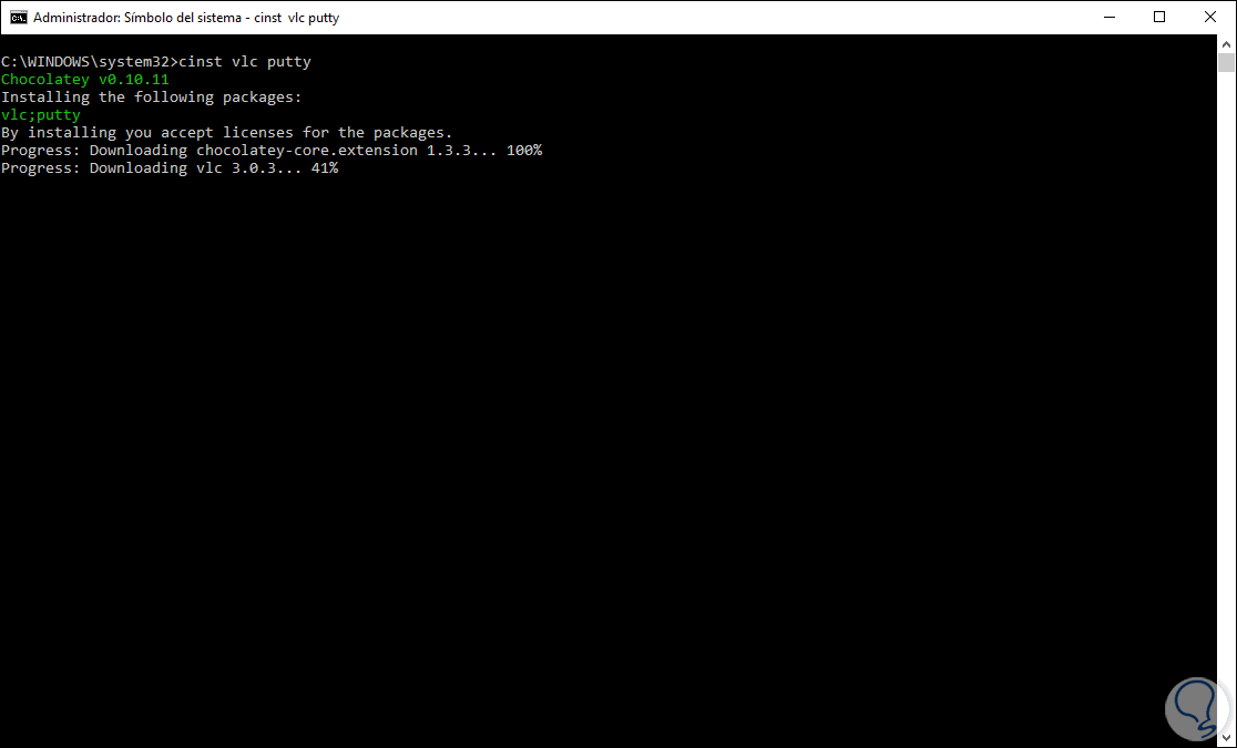 cinst puttyAl pulsar Enter se iniciará el proceso de instalación de la aplicación seleccionada y veremos el proceso de descarga, en caso de contar con scripts, debemos confirmar la ejecución de estos: