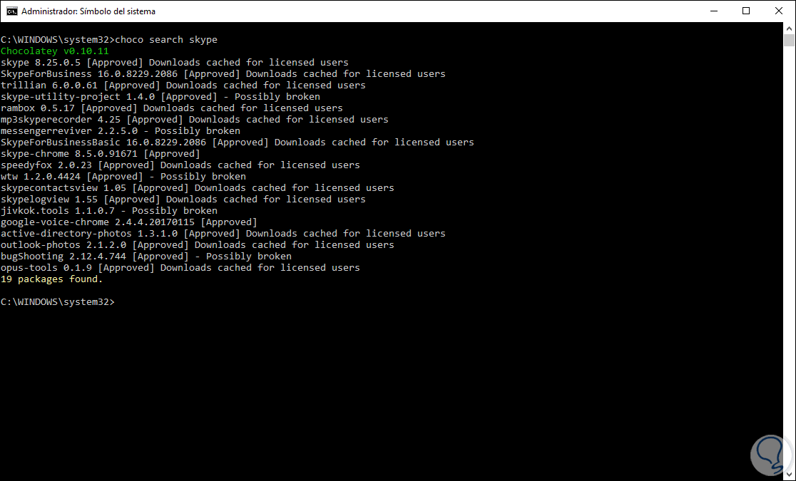 Es vital saber el nombre exacto que Chocolatey usa para cada programa a instalar, como existen diversas opciones de uso, una alternativa que nos ofrece Chocolatey para comprobar las opciones disponibles es la siguiente línea: