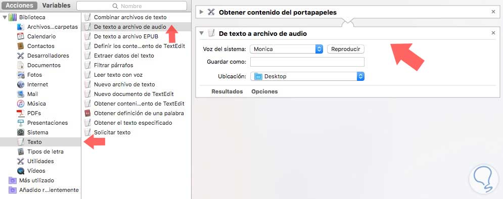 Lo siguiente que tenemos que hacer es dirigirnos a la primera columna de la izquierda y seleccionar donde pone “Texto”, y a continuación en la segunda columna “De texto a archivo de audio” y arrastrarlo hasta la tercera columna de nuevo.
