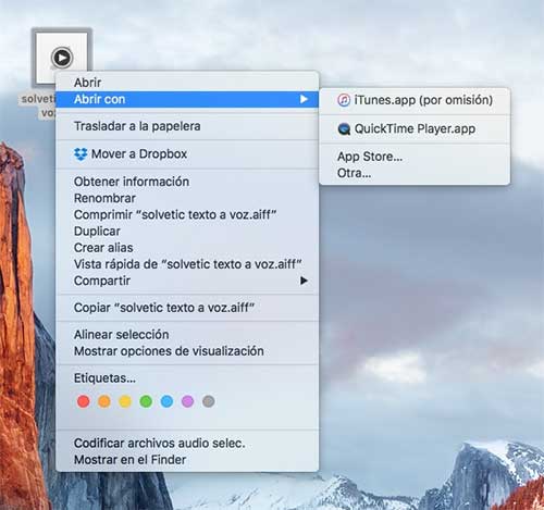 Una vez hemos ejecutado la acción, automáticamente aparecerá un archivo en nuestro escritorio o donde hayamos seleccionado guardarlo con el texto convertido a voz. Para escucharlo debemos pinchar sobre el archivo y seleccionar con que tipo de programa queremos ejecutarlo. A partir de este momento ya puedes escuchar el texto seleccionado.