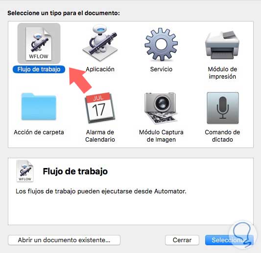 Lo siguiente que debemos hacer es dirigirnos a la app de Automator. En el caso de que no sepamos donde se encuentra debemos buscarla en las aplicaciones de Mac. Una vez dentro de la aplicación de Automator tenemos que seleccionar “Flujo de trabajo”