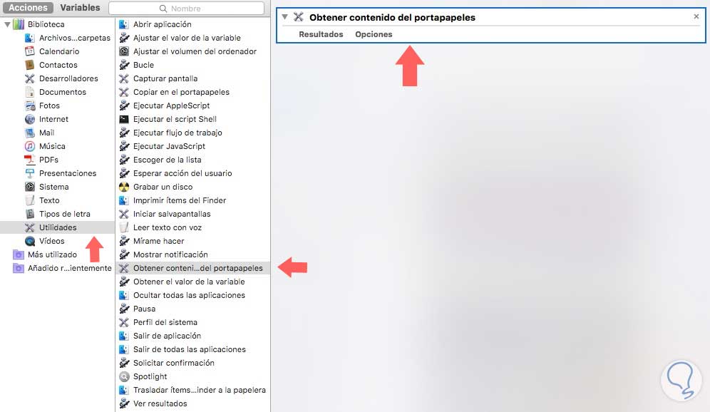 Ahora que ya hemos seleccionado flujo de trabajo, nos encontraremos con el menú principal de Automator. Debemos situarnos en el lateral izquierdo y seleccionar donde pone “Utilidades”, y una vez seleccionado, en la segunda columna debemos buscar donde pone “Obtener contenido del portapapeles” y arrastrarlo hasta la tercera columna.