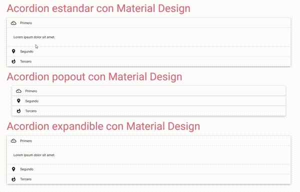 Los acordiones en Material Design no solo son sencillos de implementar, también tenemos varias funcionalidades para los mismos, lo que nos da una variedad mucho más amplia para nuestro sitio web, entre ellos tenemos los siguientes:
