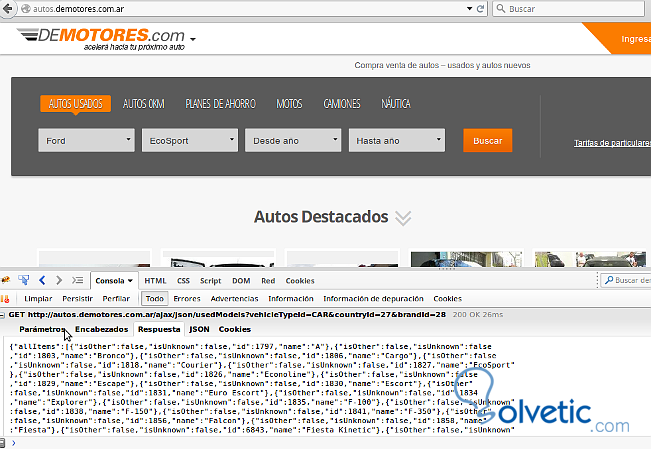 En la pestaña consola al hacer una búsqueda de Marcas, veremos que en la consola se muestra que se invoca a una función en Ajax que hará una consulta a una base de datos mediante php y devuelve los modelos en formato JSON y los añade al combo Modelos, ademas podemos ver los paramentos enviados, el encabezado devuelto por get o post y la respuesta. Veamos otro caso de una tienda online.