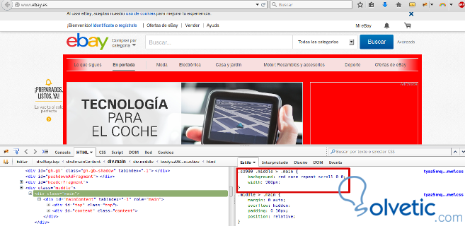 permite ver la estructura de la web y editar en tiempo real del código de la página web. Podemos por ejemplo modificar el código HTML del sitio web o el código css y verlo directamente sin que esos cambios sea permanentes. Por ejemplo sí accedemos a la web de Ebay, podemos utilizar Firebug para cambiar el color del bloque de contenido de la web o main.