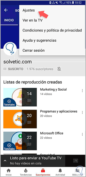 En el dispositivo que hará de mando a distancia necesitas tener instalada la aplicación de Youtube disponible en Google Play y en iTunes. Ábrela y pulsa el icono de tres puntos y luego sobre “Ajustes”: