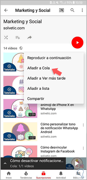 Ahora solo tenemos que añadir los vídeos que queramos a la Cola para que se vayan reproduciendo en la TV, aparecerán automáticamente al pulsar el play.