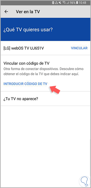 Pulsaremos sobre la opción de “Introducir código de TV” para poner el mismo que nos aparecía en la pantalla de TV.