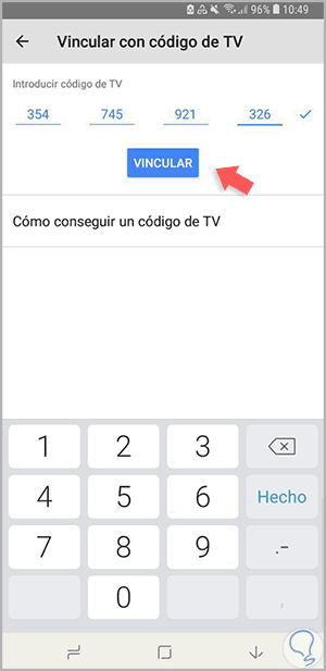Si pulsamos en vincular con un código de TV veremos cómo aparecen los números que tendremos que introducir en nuestro móvil.
