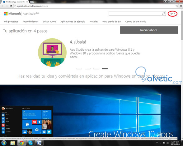 En un ordenador, debes ingresar a appstudio.windows.com, el siguiente paso es entrar con nuestra cuenta Microsoft. Haremos click en Sign in.
