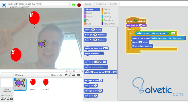 Mediante la cámara de vídeo podemos programar los eventos para controlar un objeto a través del movimiento, así podemos crear un juego de reventar globos, matar bichos, ejecutar un sonido cuando se toque determinado elemento.