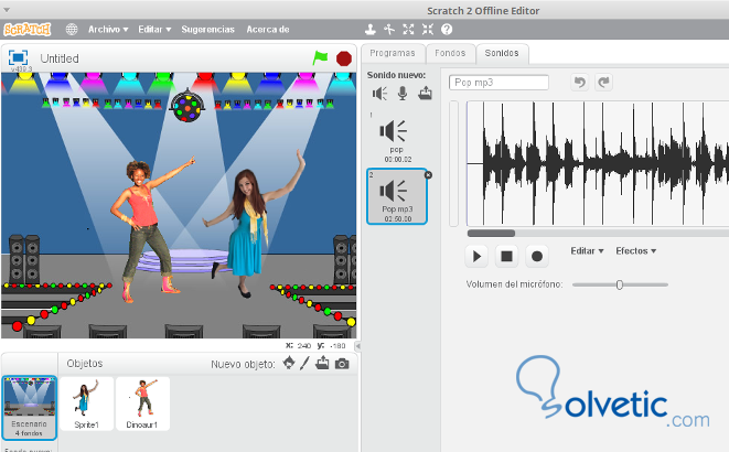 Nos falta poner la música para que las chicas bailen, para ello seleccionamos el Escenario y vamos a la pestaña sonido aquí añadimos un mp3 que nos guste.