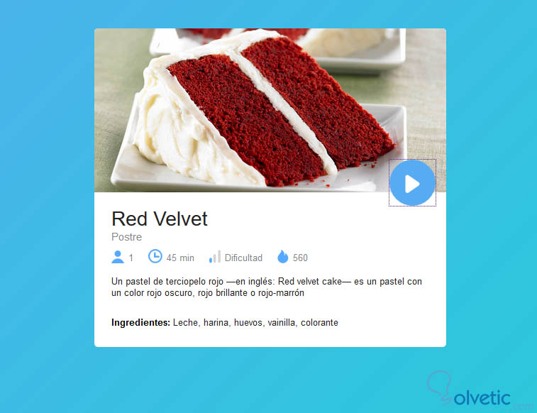 <div class="recipe-card"> <aside> <img src="red-velvet.jpg" alt="Red Velvet" /> <a href="#" class="button"><span class="icon icon-play"></span></a> </aside> <article> <h2>Red Velvet</h2> <h3>Postre</h3> <ul> <li><span class="icon icon-users"></span><span>1</span></li> <li><span class="icon icon-clock"></span><span>45 min</span></li> <li><span class="icon icon-level"></span><span>Dificultad</span></li> <li><span class="icon icon-calories"></span><span>560</span></li> </ul> <p>Un pastel de terciopelo rojo —en inglés: Red velvet cake— es un pastel con un color rojo oscuro, rojo brillante o rojo-marrón.</p> <p class="ingredients"><span>Ingredientes: </span>Leche, harina, huevos, vainilla, colorante, azucar, mantequilla.</p> </article> </div>Aquí agregamos adicionalmente la imagen para nuestra receta, que cada uno de ustedes modificará de acuerdo a sus necesidades, veamos que llevará nuestro archivo .css.