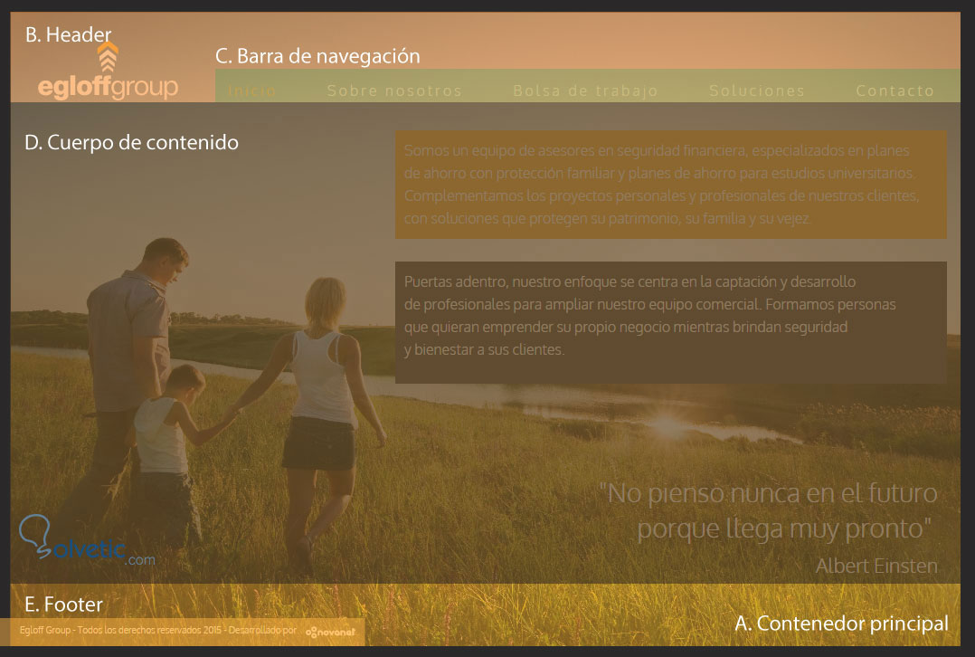 E) Footer: Comúnmente es usado para contener información legal de la página web, barras de navegación auxiliares y los responsables del diseño e implementación del sitio web. Desde el punto de vista del diseño siempre está al final cerrando el diseño. En el caso de ejemplo el footer está contenido dentro de una etiqueta div y tiene designada la clase .footer-index, como es posible ver en la imagen mostrada.