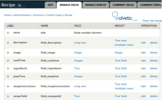 - Para la propiedad cookTime los ajustes serán: label: cookTime, name: field_cooktime, type: Integer, widget: Text field.