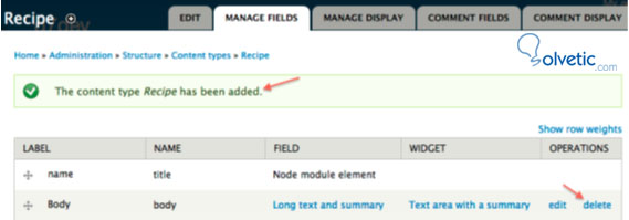 - Luego eliminamos el campo de Body que es añadido automaticamante a nuestro content type. Hacemos click en el link de delete y luego confirmando en la pantalla siguiente.