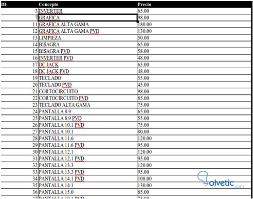 En este caso tenemos una lista de precios servicio y partes de ordenadores.
