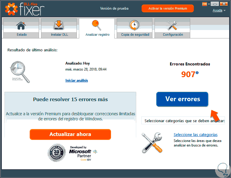 En la pestaña “Analizar Registro” DLL-files fixer también nos da la opción de encontrar errores de registro que no pudieron ser detectados por otros programas dando clic en la pestaña “Ver errores”.