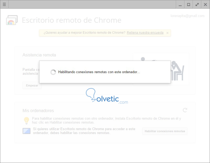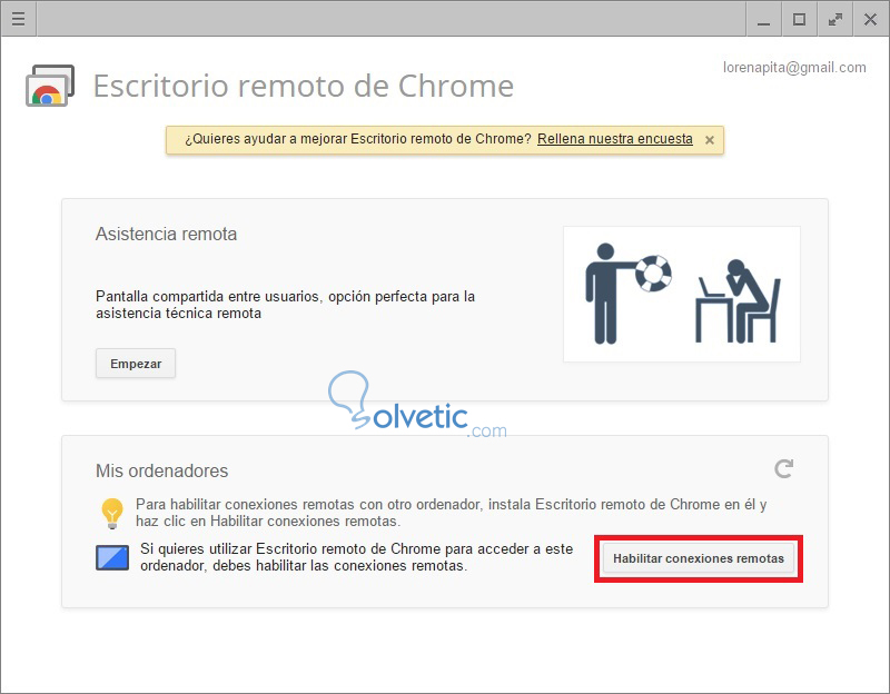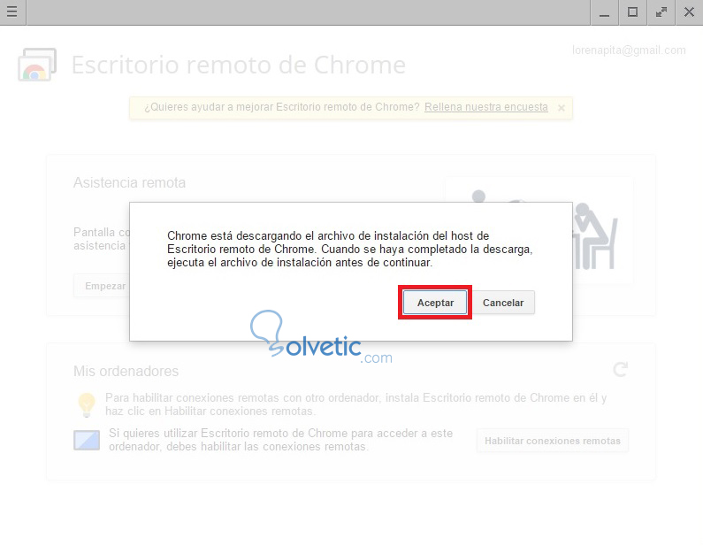Para poder acceder al equipo en el que nos encontramos desde cualquier navegador Chrome será necesario instalar en él el host de escritorio remoto. Para ello pulsa sobre el botón Habilitar conexiones remotas