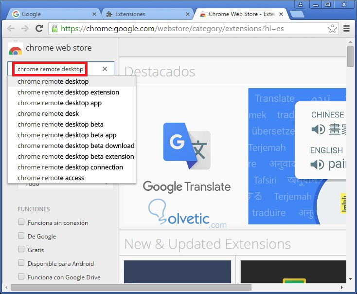 Se abrirá en una nueva pestaña la tienda de aplicaciones y extensiones de Chrome (llamada chrome web store); teclea Chrome Remote Desktop ó Escritorio remoto de Chrome en el buscador situado en la parte izquierda de la ventana, a fin de localizar la aplicación.