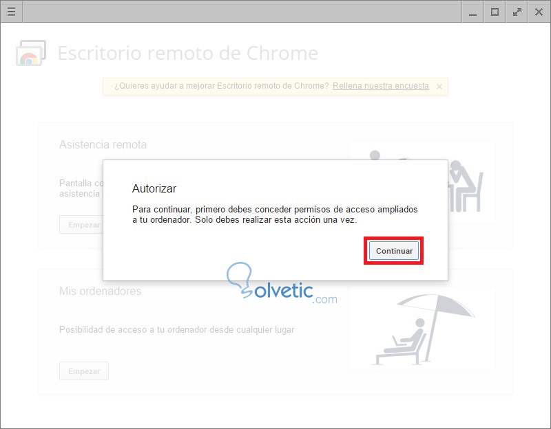La primera vez que accedes a la aplicación, deberás autorizar los accesos remotos. Para ello, haz clic en Continuar.