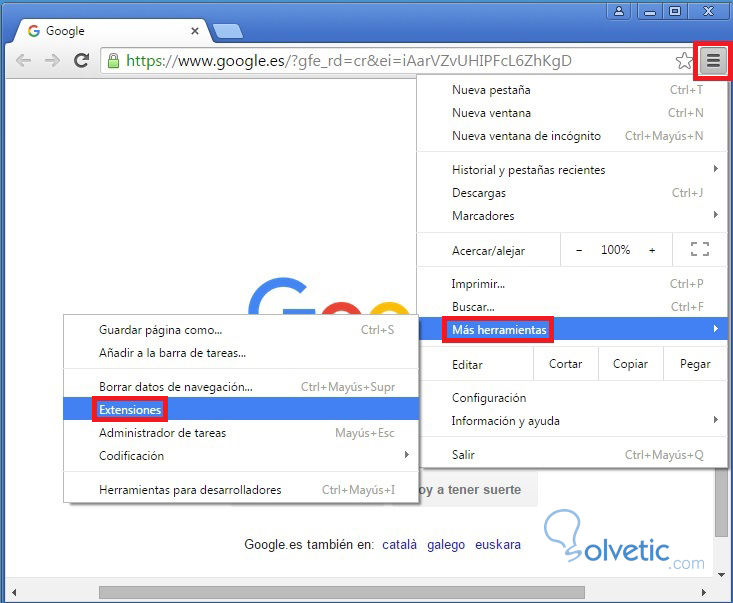 Para ello, abre una ventana del navegador y, a continuación, haz clic sobre el botón del menú situado en la parte superior derecha de la ventana; una vez allí, pulsa sobre Más herramientas y luego, sobre Extensiones.