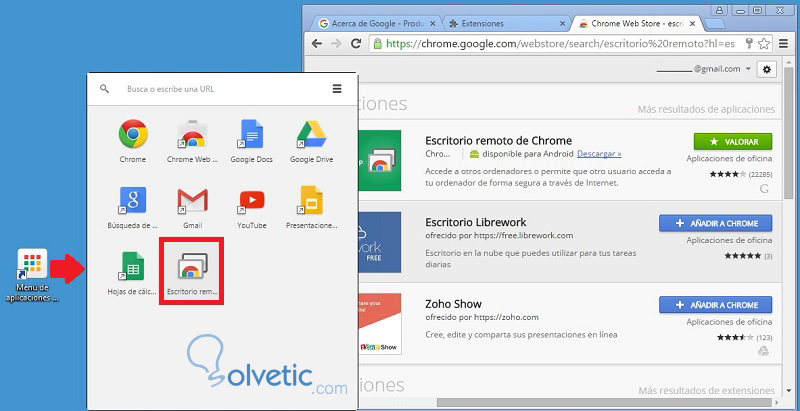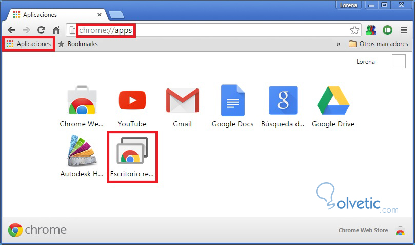 Pulsa, en el caso de que lo tengas habilitado, sobre el acceso directo a tus aplicaciones de Chrome de la barra de favoritos o teclea en la barra de direcciones la url chrome://apps. A continuación, haz clic sobre el icono Escritorio remoto de Chrome.