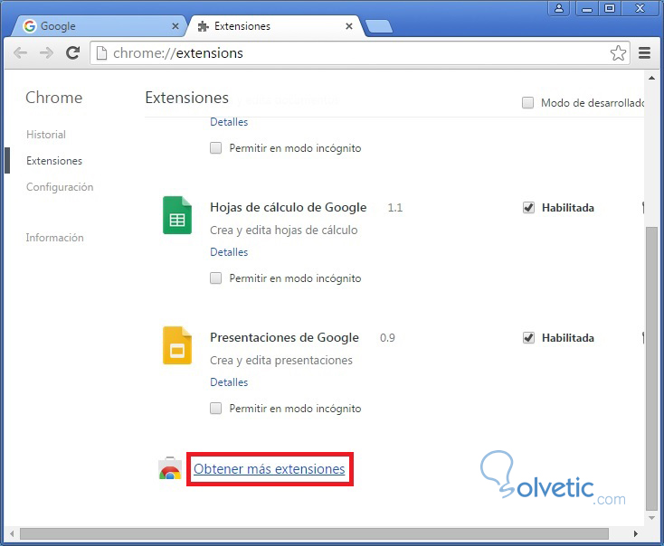 Se abrirá una nueva ventana en la que se muestran las extensiones instaladas actualmente en el navegador. Desplázate hasta el final del listado y haz clic sobre el enlace Obtener más extensiones.