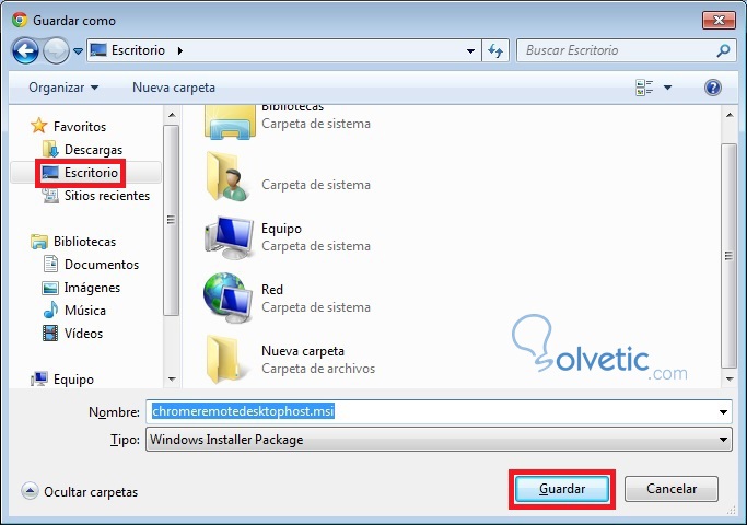 Se abrirá una ventana del explorador de archivos en la que deberás seleccionar la ruta donde deseas guardar el archivo de instalación. Indica una ubicación y pulsa sobre Guardar.
