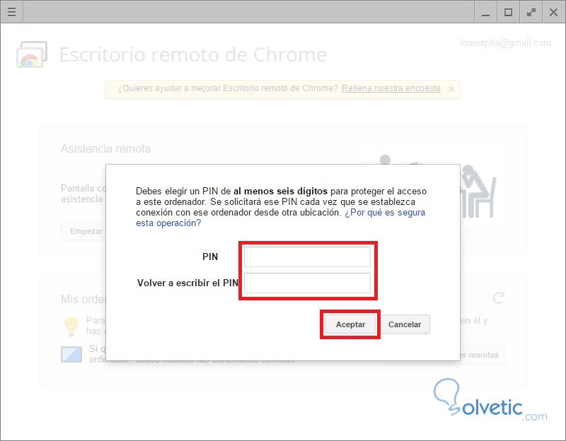 Una vez finalizada la instalación deberás indicar, en la ventana de Chrome Remote Desktop, el PIN que será necesario teclear para acceder remotamente a este equipo (como mínimo de 6 dígitos) y a continuación hacer clic sobre el botón Aceptar.