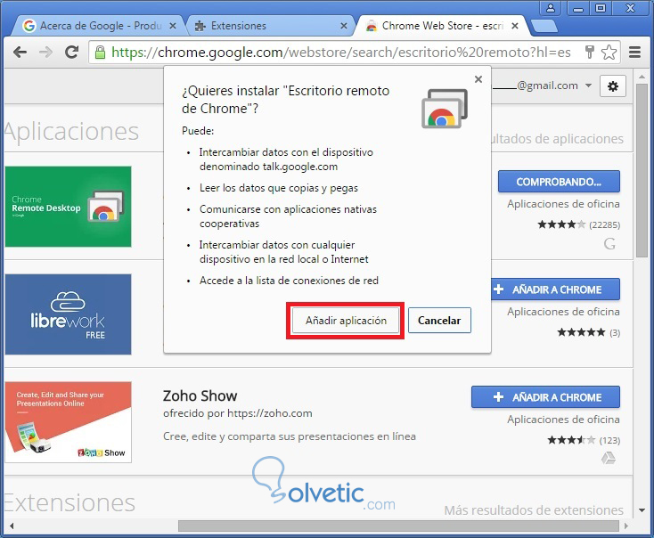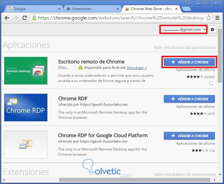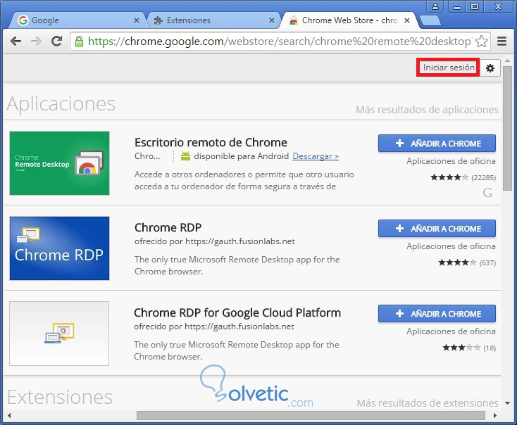 Para que Chrome Remote Desktop se añada a tus aplicaciones de Chrome y la puedas usar desde cualquier navegador Chrome, debes iniciar sesión con tu cuenta de Google. Haz clic sobre Iniciar sesión en la parte superior derecha de la tienda e introduce la dirección de correo electrónico y contraseña de tu cuenta de Google (Gmail).