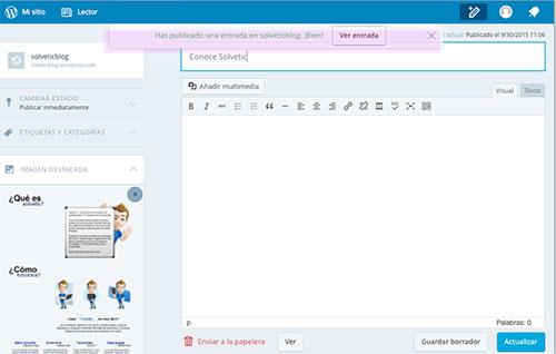 Una vez tengamos todo ajustado y rellenado tal y como queremos que salga publicado, debemos seleccionar “Publicar”. Una vez hayamos seleccionado esta opción, nos notificarán en la parte superior que ya podemos ver nuestra entrada pulsando “Ver entrada”.