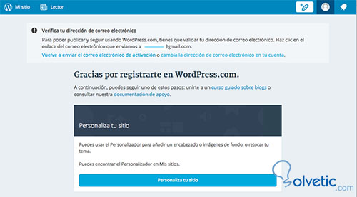 Lo primero de todo es validar la dirección desde el correo que hemos indicado en el paso anterior y comenzar a personalizar nuestro sitio.