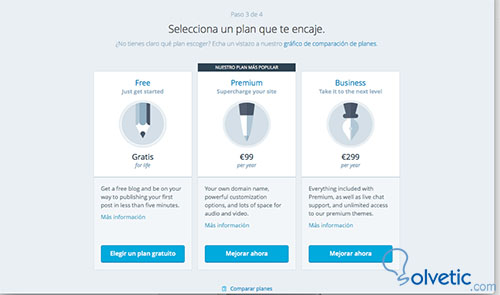 Aquí debes seleccionar si quieres que sea gratuito o de pago. Te aconsejamos que si tu Blog va ser un hobby mas que otra cosa, selecciones el plan gratuito que te va a permitir 3GB gratuito.