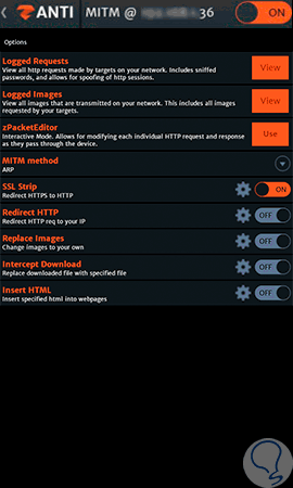 Para ello añadimos el dominio o la IP y escaneamos los puertos, luego vamos a las acciones de ataque y seleccionamos Man in the middle, a continuación activamos poniendo en ON previamente la herramienta y seleccionamos todas las opciones y en partícula la opción Reemplace image, donde seleccionamos desde la galería de fotos del móvil que imagen utilizaremos.