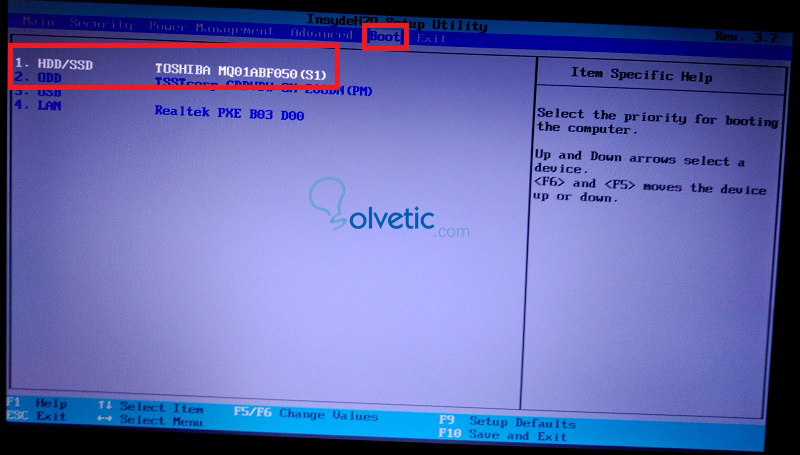 También es necesario restringir el arranque del ordenador únicamente desde el disco duro, para que no se pueda iniciar desde una versión Live de un Sistema Operativo. Para ello busca dicha opción en el apartado Boot. Tal y como se muestra en la captura, hemos asignado el Disco Duro como unidad de arranque principal para que no sea posible utilizar otro medio de arranque sin antes poner la contraseña del Disco Duro.