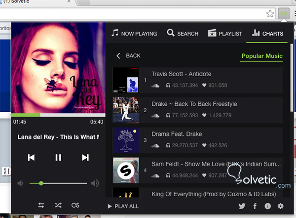 En este momento ya puedes seleccionar tanto el género musical, como hacer una búsqueda propia de la canción o el artista o crear una lista de reproducción. Como podemos observar, en esta extensión, podemos controlar el volumen, para la reproducción, pasar de canción, crear una lista aleatoria…