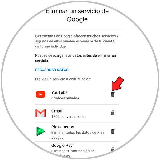 A continuación verifica tu identidad de la cuenta. Verás todos los servicios asociados. En este caso debes pulsar sobre la papelera que aparece al lado de la cuenta de YouTube.