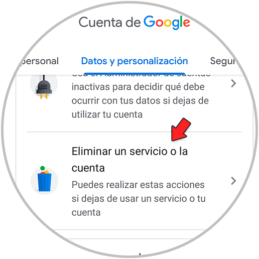 Lo siguiente será situarte en la pestaña de "Datos y personalización" y entrar dentro del apartado "Eliminar un servicio o la cuenta".