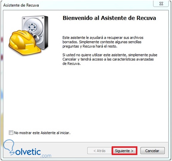 Al iniciar el Recuva, aparece una ventana con el “Asistente de Recuva”, que consiste en cuadros de preguntas para tener más detalles acerca de lo que queremos buscar como tal, es recomendable utilizar este asistente pues te permite realizar una búsqueda mucho mejor.