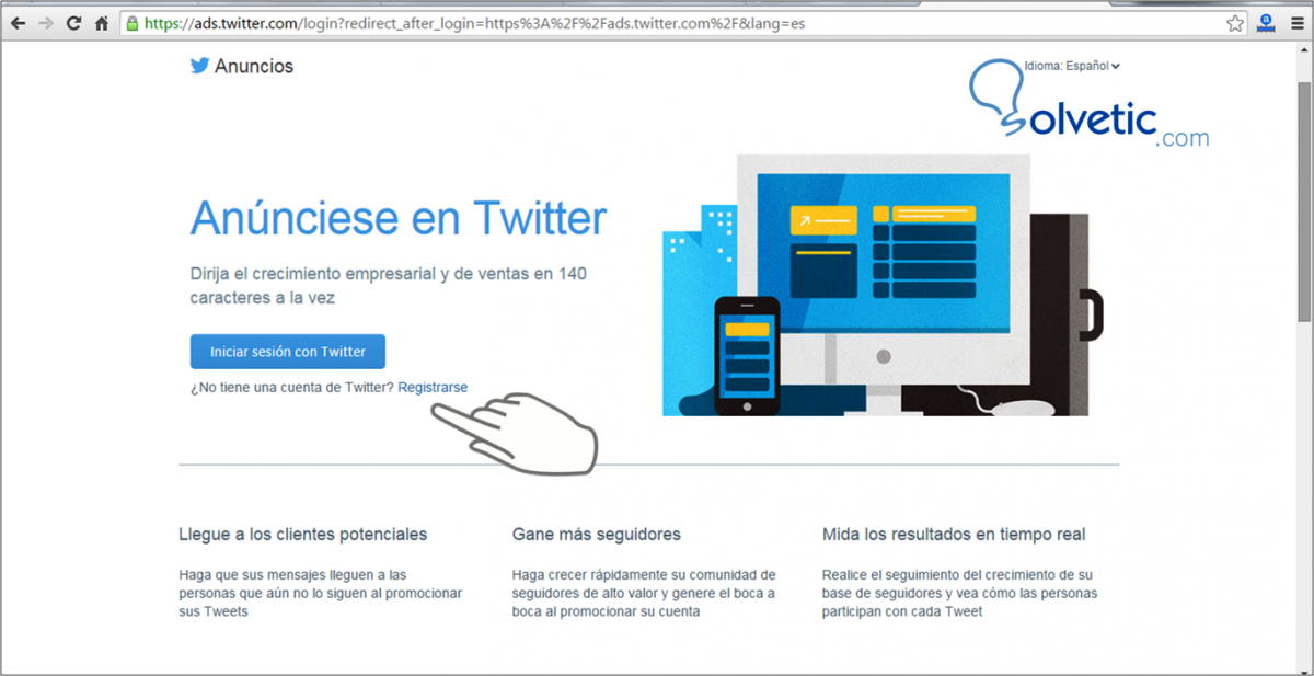 Para dar comienzo a la aplicación para hacer campañas con anuncios en Twitter coloque el siguiente URL https://ads.twitter.com/ en el navegador de su preferencia.