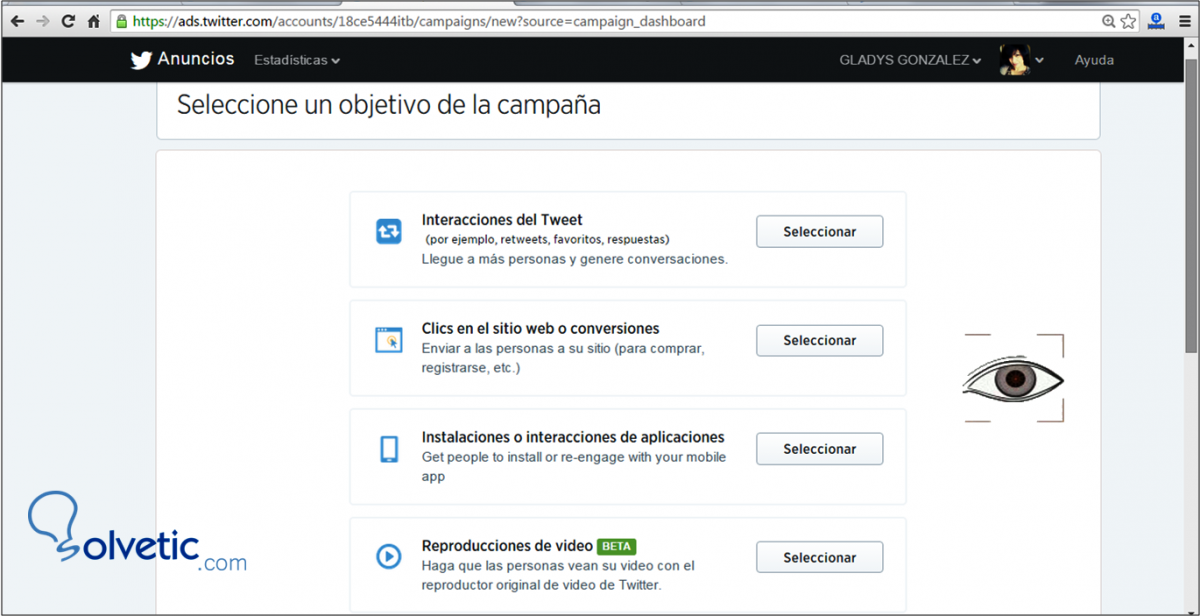 La aplicación de Twitter ads ofrece al usuario 6 opciones de campañas para que seleccione la que se ajuste a su plan de marketing digital para efectos de este tutorial se estará realizando la configuración de la opción Nro. 2 Click en el sitio web o conversiones.
