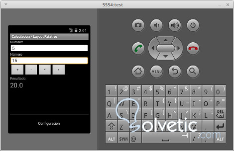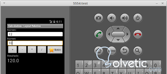 }Ejecutamos la aplicación y al activarse el emulador veremos la siguiente pantalla.La primera caja de texto acepta solo números que contengan 1 o 5 ya que indicamos, que pueden ser combinaciones de los dígitos en las especificaciones de diseño con la propiedad android:digits="12345"