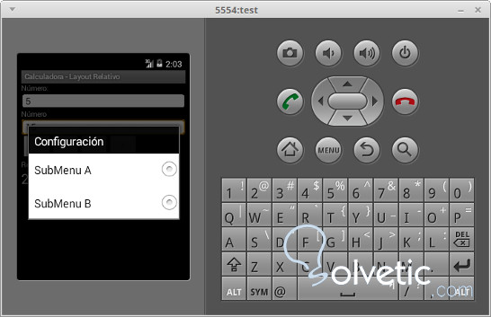 </resources>Ejecutamos nuevamente la aplicación y luego presionamos el botón menú y hacemos un clic en Configuración.Hemos logrado una aplicación completamente funcional, para probar como funciona si giramos el móvil y la pantalla debe acomodarse presionamos: