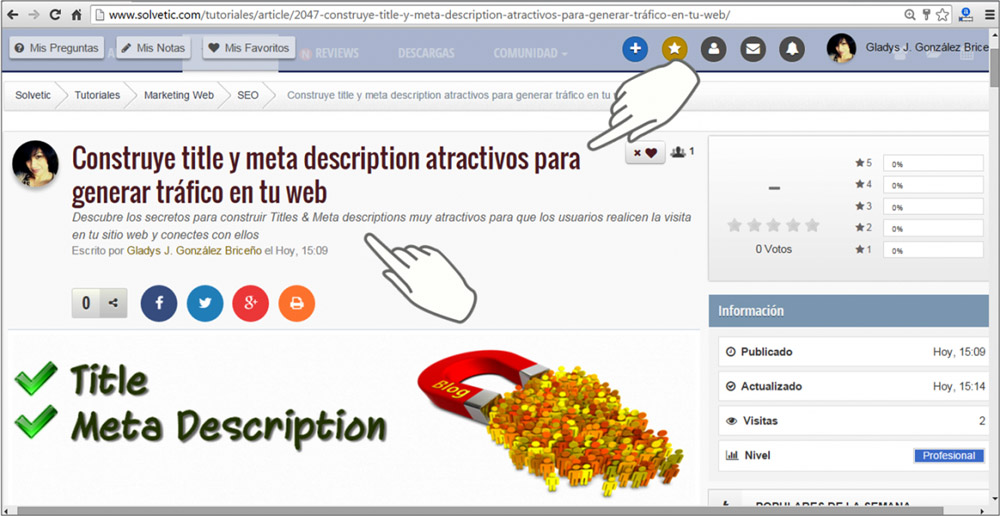 • Meta Description: Descubre los secretos para construir Titles & Meta descriptions muy atractivos para que los usuarios realicen la visita en tu sitio web y conectes con ellos.