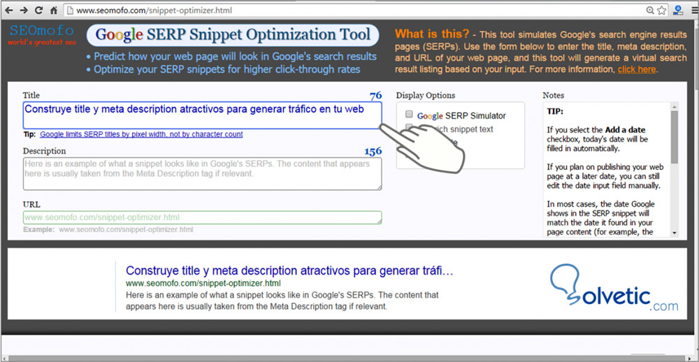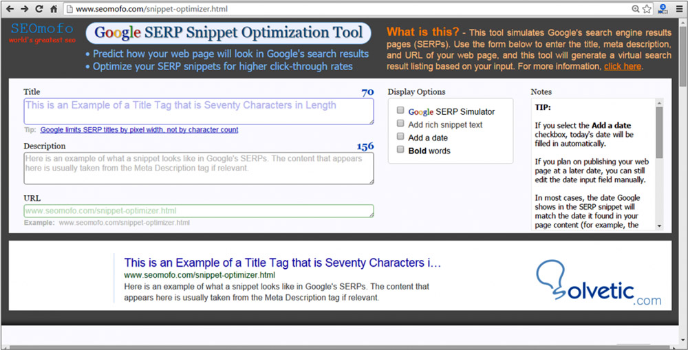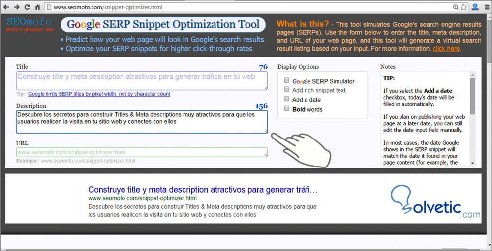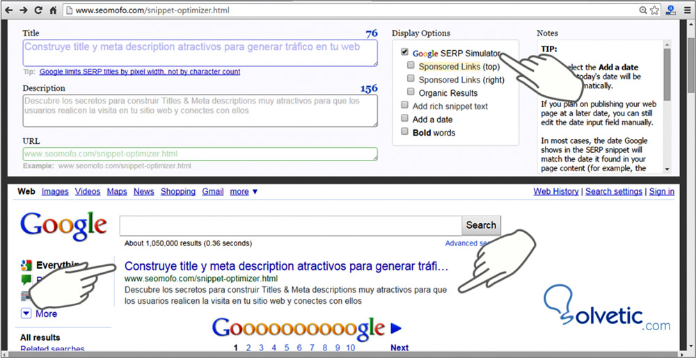 Para tener acceso a la aplicación ingrese la siguiente URL en el navegador de su preferencia http://www.seomofo.c...-optimizer.html. Este aplicativo permite hacer el ajuste en línea de ambos elementos con el objeto de presentar el “look and feel” del prototipo del SERP del artículo.