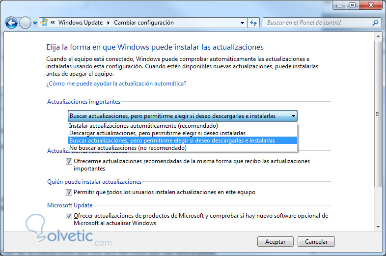 - Selecionamos Buscar actualizaciones, pero permitirme elegir si deseo descargar e instalarlas