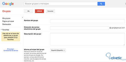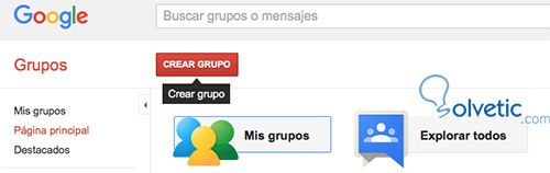 En primer lugar, tenemos que crear el grupo. Para ello debemos tener una cuenta de Google. Si no la tenemos, debemos crearla y una vez echa entrar en la dirección googlegroups.com. Ahora debemos seleccionar “Crear grupo” situado en la parte superior izquierda.