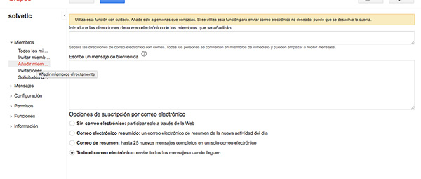 Además de añadir miembros, podemos realizar otras opciones de configuración como revisar todos los miembros, los mensajes, los permisos, las funciones…