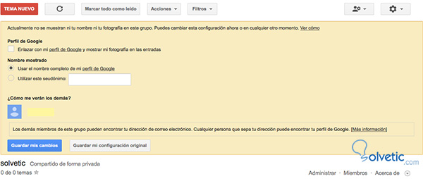 En este paso tienes que rellenar tu perfil. Seleccionar si quieres poner foto, si quieres tener un seudónimo o si quieres enlazar tu grupo con tu perfil Google.